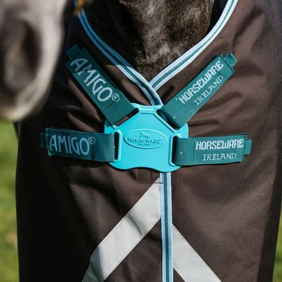 Das Amigo Bravo 12 Plus ist das meistverkaufte Amigo Turnout. Diese Decke zeichnet sich durch einen starken Oberstoff aus wasserdichtem und atmungsaktivem 1200 Denier Polyester aus. Der Innenstoff besteht aus glattem Polyester, das für ein glänzendes Fell sorgt. Die Decke ist mit 250 Gramm gefüttert. Die Decke hat einen Disc-Frontverschluss, der für mehr Bewegungsfreiheit sorgt. Die Decke ist außerdem mit vorderen Beinausschnitten, Reflexstreifen, Kreuzgurten und dem Liner-System ausgestattet.