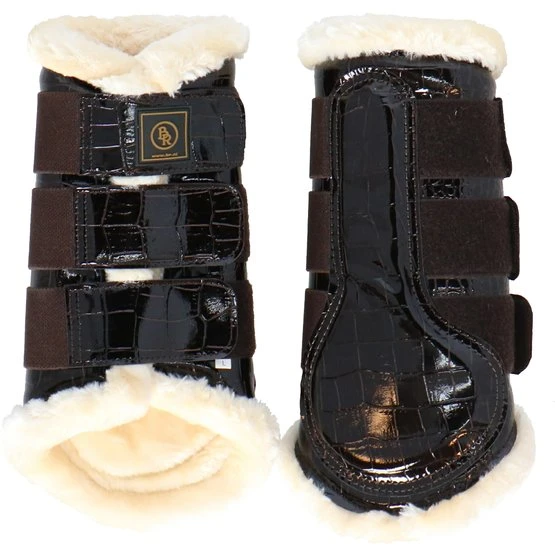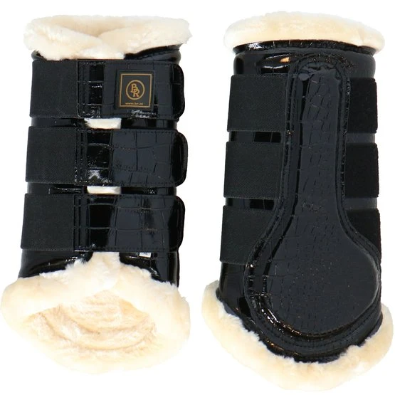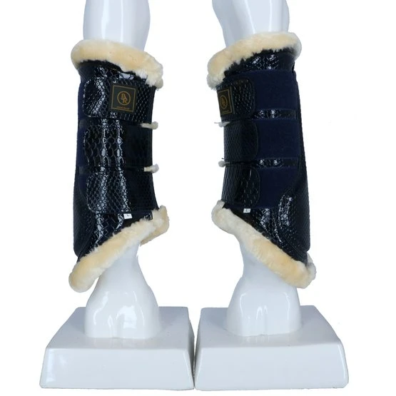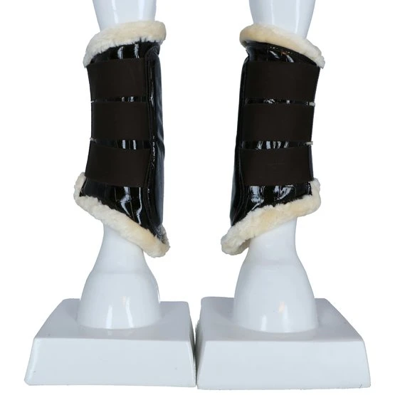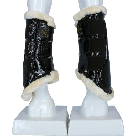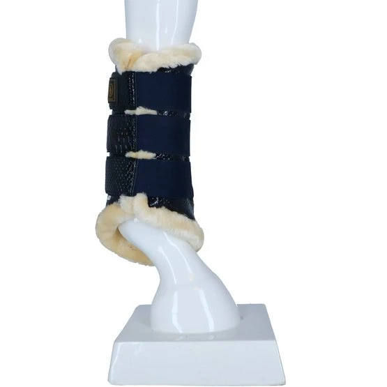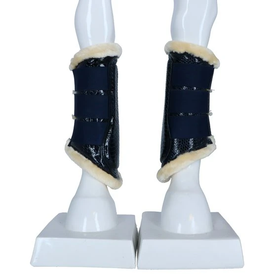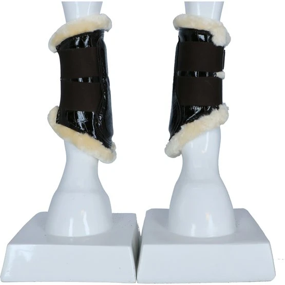 Stilvolle Gamaschen aus Kunstlackleder mit Krokodruck und weichem Futter aus synthetischem Lammfell. Dieses schaffreundliche Fell ist sehr weich, leicht, atmungsaktiv und besonders pflegeleicht. Das Futter sorgt für eine optimale Druckverteilung und hilft bei der Vorbeugung von Druckstellen. Ideal für Pferde mit empfindlicher Haut. Der Aufprallzone der Gamaschen ist mit einer Schicht aus stoßdämpfendem Neopren versehen, was zusätzlichen Schutz bietet. Die Gamaschen haben drei robuste Klettverschlüsse mit Elastikeinsatz. Aufgrund der flexiblen Form und der verstellbaren Klettverschlüsse können die Gamaschen perfekt an das Bein angepasst werden. Geeignet für die Vorder- und Hinterbeine. Paarweise verpackt. Maschinenwaschbar.