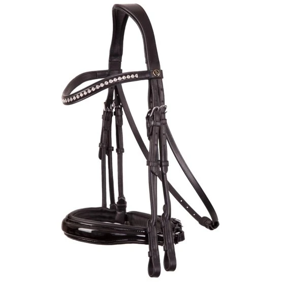 Dieser symmetrische Kandarenzaum aus hochwertigem europäischem Leder hat ein E-Line-Genickstück. Dieses anatomisch geformte Genickstück ist weich gepolstert und bietet dank seiner runden Form zusätzliche Ohrenfreiheit. Das geschwungene Stirnband ist mit silberfarbenen Kristallen von Swarovski® verziert und mit weichem Leder unterlegt. Der Kehlriemen lässt sich mithilfe der Schnalle auf der Unterseite verstellen. Die Schnalle verfügt über eine zusätzliche Schutzlasche. Die Backenstücke sind aus rundgenähtem Leder gefertigt und mit Zaumhaken ausgeführt. Die Kandare hat ein breites schwedisches Reithalfter (ca. 4 cm) in Lacklederausführung mit rundgenähten Riemen. Das Reithalfter ist rund bombiert, weich gepolstert und mit einem breiten, weich gepolsterten Kinnschutz versehen. Dank der anatomischen Form gibt es mehr Platz für die Gebissringe. Die Kandare ist mit glänzenden silberfarbenen Beschlägen aus verchromtem Messing ausgerüstet. Ohne Zügel.