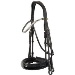 Dieser symmetrische Trensenzaum aus hochwertigem europäischem Leder hat ein E-Line-Genickstück. Dieses anatomisch geformte Genickstück ist weich gepolstert und bietet dank seiner runden Form zusätzliche Ohrenfreiheit. Das gebogene Stirnband ist mit zwei Reihen großer Kristalle von Swarovski® verziert und mit weichem Leder unterlegt. Der Kehlriemen ist mit einer Schnalle unten verstellbar. Die Schnalle verfügt über eine zusätzliche Schutzlasche. Der extra breite (± 5 cm) schwedische Reithalfter mit Lackleder ist rund bombiert, rundgenäht, weich unterlegt und hat ein breites, weiches Kinnpolster. Das Reithalfter ist außerdem anatomisch geformt. Die Kandare hat Zaumhaken und runde, silberfarbene Beschläge. Lieferung ohne Zügel.