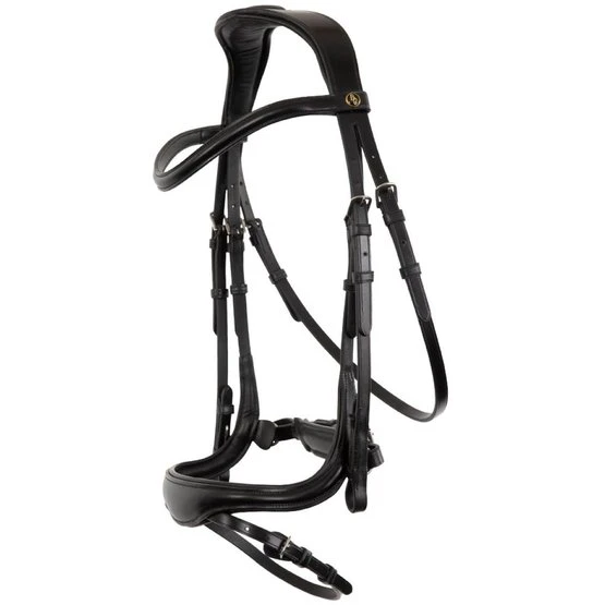 Dieser anatomische Trensenzaum zeichnet sich durch seinen U-förmigen Anbindenasenriemen und das breite, weiche Genickstück aus.