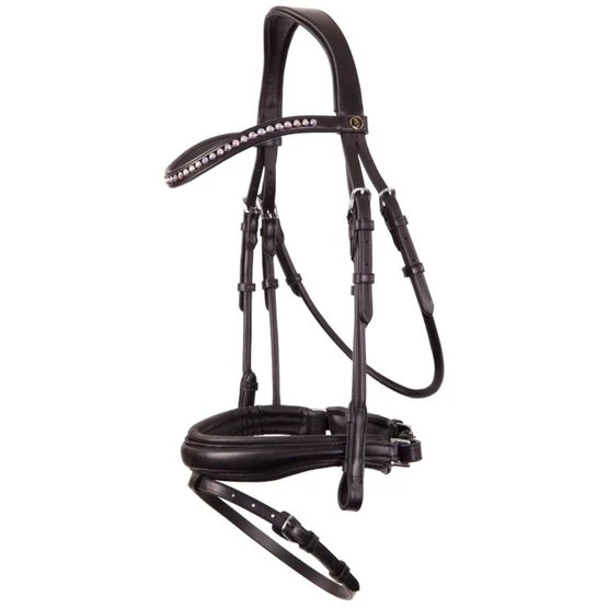 Dieser symmetrische Trensenzaum aus hochwertigem europäischem Leder hat ein E-Line-Genickstück. Dieses anatomisch geformte Genickstück ist weich gepolstert und bietet dank seiner runden Form zusätzliche Ohrenfreiheit. Das geschwungene Stirnband ist mit silberfarbenen Kristallen von Swarovski® verziert und mit weichem Leder unterlegt. Der Kehlriemen ist beidseitig verstellbar. Sowohl der Kehlriemen als auch die Backenstücke sind aus rundgenähtem Leder gefertigt. Die Backenstücke sind mit Zaumhaken versehen. Die Trense hat ein breites, rundgenähtes schwedisch kombiniertes Reithalfter (ca. 4 cm). Das Reithalfter ist rund bombiert, weich gepolstert und mit einem breiten, weich gepolsterten Kinnschutz versehen. Dank der anatomischen Form gibt es mehr Platz für die Gebissringe. Die Trense hat eine V-förmige Sperrriemenschlaufe und die Schnalle des Sperrriemens verfügt über eine zusätzliche Schutzlasche. Die Trense ist mit glänzenden silberfarbenen Beschlägen aus verchromtem Messing ausgerüstet. Ohne Zügel.