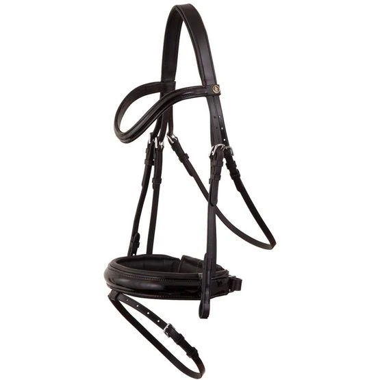 · Extra breites schwedisch kombiniertes Reithalfter (Flaschenzugeffekt), rund bombiert, mit Lackleder, weich gepolstert mit einem gefütterten Kinnschutz.