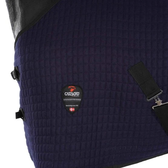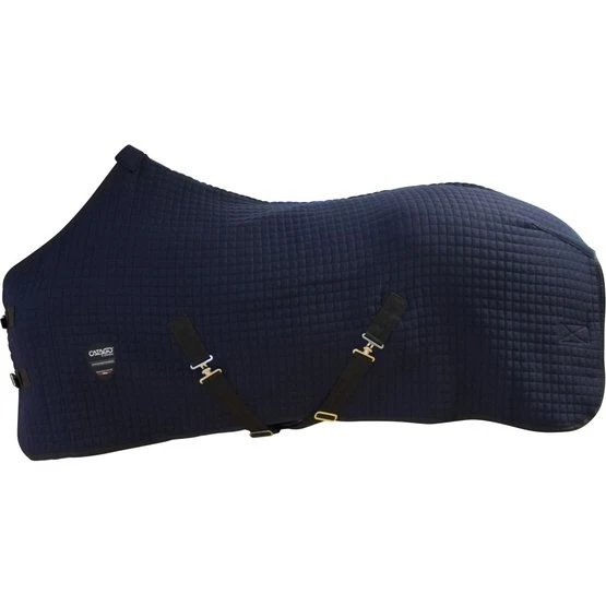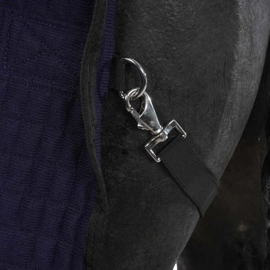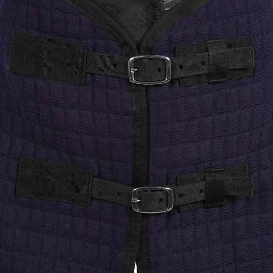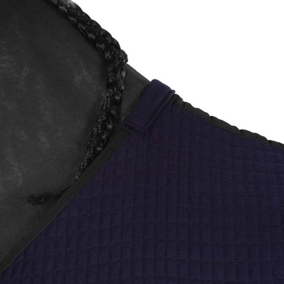 Bequemer und funktioneller Kühlteppich aus 100% Acryl mit Wolleffekt. Ideal als Transportteppich oder nach dem Training, da das Material überschüssige Wärme und Schweiß vom Pferd wegtransportiert. Der Teppich hat eine schwarze Bindung, einen doppelten Frontverschluss, abnehmbare Quergurte und elastische Beinriemen.