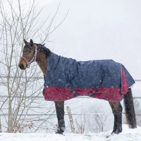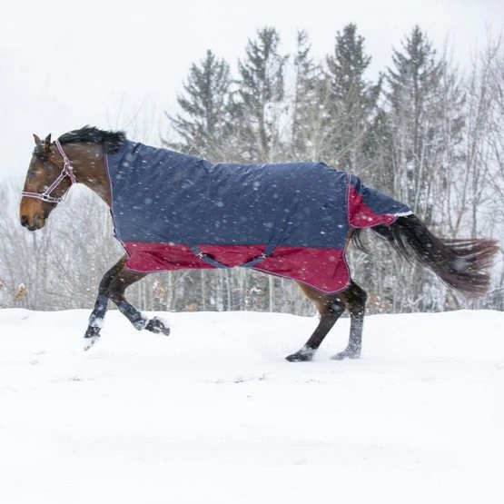 Wasserdichter und atmungsaktiver Outdoor-Teppich mit halbem Hals aus Ripstop-Polyester mit 1200 Denier, Klebebandnähten und Nylonfutter. Verfügt über eine sehr große wasserdichte Heckklappe, die mit einem reflektierenden Band, niedrigen Kreuzstreifen und Beinriemen verziert ist. Schneller Verschluss auf der Brust, verstärkt mit Klettbändern, mit Größenangabe auf Gummipatch.