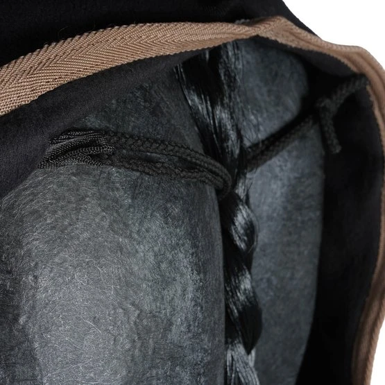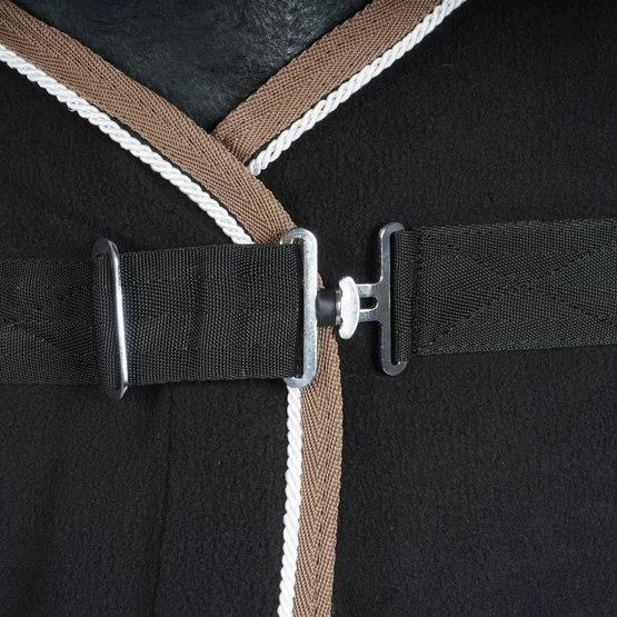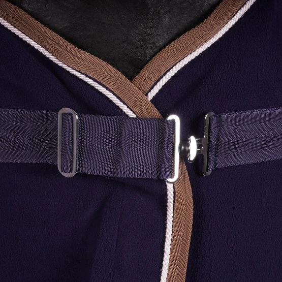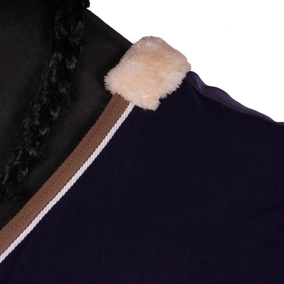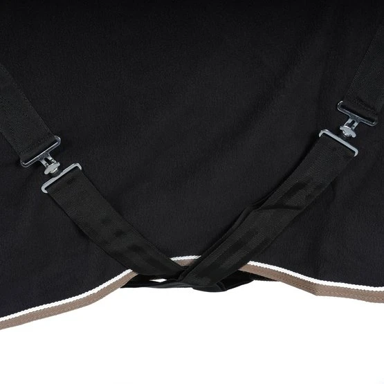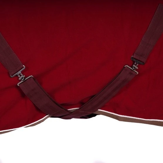 Praktisch und vielseitig, als Trockner, Unterlage oder zum Transport geeignet, aus 100% Polyester-Flusenschutzvlies mit einer Nennleistung von 280 g / m². Rand verziert mit kontrastierenden Paspeln und Geflecht. Ausgestattet mit einem Low-Cross-Gurtband mit vollständig abnehmbaren Schnallen und Gummistopfen, einer Widerristhaut aus synthetischem Lammfell und einem Schweifriemen. Verstellbarer Brustverschluss mit Metallschnalle.