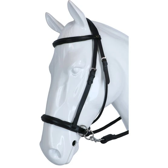 FRA Gebissloses System 5: Gebisslose Zaumzeuge sind nicht neu! Jahrhundertelang galt ein gebissloses Zaumzeug als selbstverständlich, bevor man überhaupt daran dachte, dem Pferd etwas ins Maul zu legen, legte man einfach etwas darum. Damals reichte ein Seil als Halfter und so entstand das erste gebisslose Zaumzeug. In Kombination mit Stützgewicht, Bein- und Tasthilfe hält die Reiterhand über die Zügel den Kontakt nicht mit dem Maul, sondern mit dem Kopf des Pferdes. Funktionsprinzip: Druck auf Nase, Nacken und Wangen, Nacken/Kinn gekreuzte Zügel. Konstruktion: Das lederne Reithalfter dieser Trensen, auf dem Markt meist unter dem Cook-System bekannt, hat auf beiden Seiten kurz hinter den Backenstücke einen Ring. Durch diese Ringe verläuft ein geschmeidiges Lederband quer über das Kinn, über die Backen über den Hals. An beiden Enden dieses Gürtels sind die Schnallen oder Clips der Zügelenden befestigt. Auf der linken Seite der Trense finden Sie eine Schnalle für die Backenstückverstellung und eine Schnalle zum Verbinden der gekreuzten Riemen. Zum Schutz des Nackenbereichs sind beide Träger mit einer weichen Polsterung gepolstert. Die Gurte müssen von den Passanten dieses Nackenpolsters so verschoben werden, dass sie auf beiden Seiten die gleiche Länge haben. Die Schnalle des Kinnriemens ist die einzige Schnalle, die benötigt wird, um das Zaumzeug am Kopf zu befestigen. Position: Wie bei den meisten gebisslosen Zaumzeug sollte der Nasenriemen auf dem harten Teil der Nase aufliegen, ungefähr dort, wo der Nasenknochen beginnt. Der Kinnriemen kann sich „zu“ anfühlen, aber definitiv nicht festgezogen. Dies soll ein Verdrehen des Zaumzeugs verhindern. Die Backenstücke von gebisslosen Trensen mit gekreuztem Kinn- und Halssystem neigen immer dazu, sich leicht auszubeulen. In Betrieb: