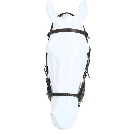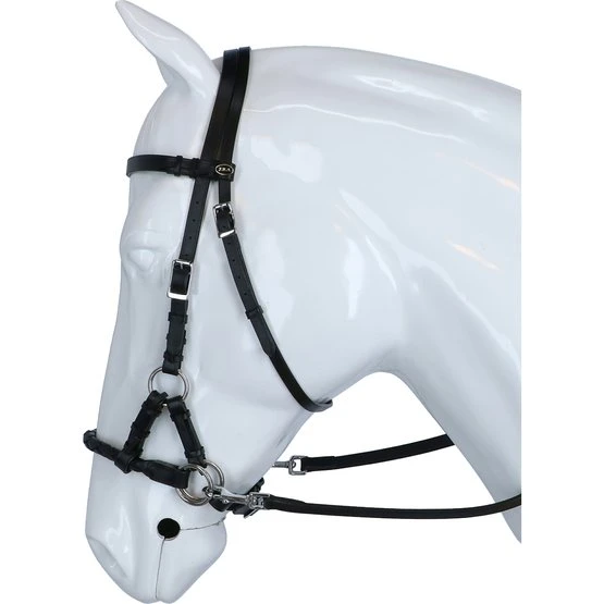 Seilknotenhalfter: Seilknotenhalfter gibt es in vielen Varianten und Ausführungen, die FRA® nh Seilknotenhalfter zeichnen sich durch eine Vielzahl an Größen in den Stärken 6, 7 und 8 mm aus. Neben einer Basisversion, der Babia, in 3 Größen, finden Sie eine 6mm-Version, die Capal, in 5 Größen und eine 7mm-Version, die Pablo, in 3 Größen. Die letzten beiden Versionen sind mit einem Nubuk bzw. Nacken- und Nasenschutz aus Leder und sind für den professionellen Einsatz bestimmt. Die Größe eines Knopfhalfters spielt eine sehr wichtige Rolle, das Halfter sollte sich ohne viel Spiel mit dem Pferdekopf verbinden. Position: Wie bei allen gebisslosen Trensen muss auch beim Seitenzug- und Knopfhalfter das Nasenband auf der harten Stelle der Nase aufliegen, etwa dort, wo das Nasenbein beginnt. Der Kinnriemen der Sidepull-Version kann sich zwar „zu“ anfühlen, aber definitiv nicht festgezogen. Dies soll ein Verdrehen des Zaumzeugs verhindern. Wirkung:Sidepull: Wörtlich übersetzt bedeutet das Wort sidepull „seitlich ziehen“. Genau das macht dieser Zaum, das Wegbewegen der Hand vom Hals (Öffnung) hat zur Folge, dass die Kombination der Verbindung von der Backe zum Nasenriemen über beide Riemen und Ring Druck auf die gegenüberliegende Wange ausübt: Twists. Das Anfordern der Zügel (Stopps) führt zu einer diskriminierenden Druckentlastung der Nase, was zu Tempowechseln und/oder Halt führt. Dies natürlich in Kombination mit anderen unterstützenden Hilfsmitteln. Das Zaumzeug eignet sich für normales Longieren nur unter Verwendung einer Longierbrille. Die Longierbrille wird in die Ringe eingehakt, an denen normalerweise die Zügel befestigt sind. Verwenden Sie zum Longieren auf den Doppelleinen und zum Longieren von Pessoa die gleichen Ringe. (verfügbare Modelle FRA® pardoes und FRA® shango)