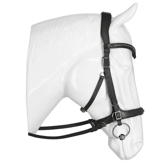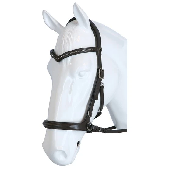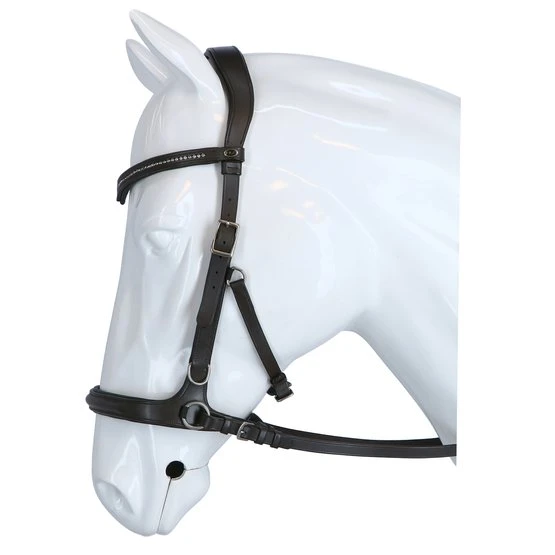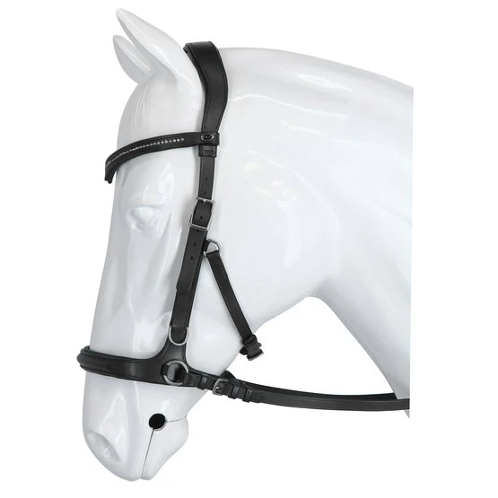 Die Trense ist aus geschmeidigem Qualitätsleder mit zwei V-förmigen Stirnbändern mit Swarovski-Steinen und ohne. Die Trense ist anatomisch und hat ein rechtes Genickstück. Stirnriemen, Genickstück und Nasenriemen sind weich gepolstert. Die Trense ist an Backenstücken, Nasenriemen und Kieferriemen verstellbar. Die Trense ist mit einem Kieferriemen anstelle eines Kehlriemens ausgestattet, um zu verhindern, dass die Backenstücke gegen die Augen rutschen.