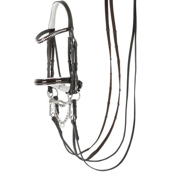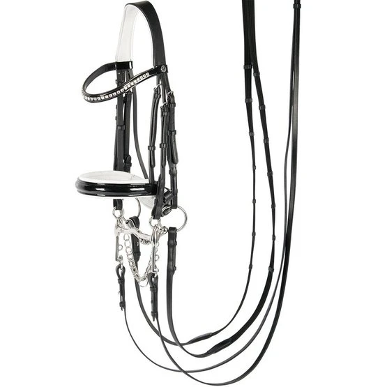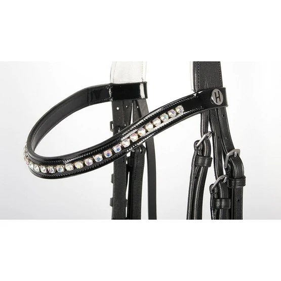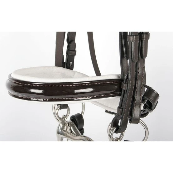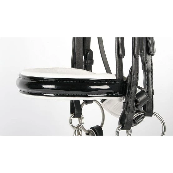 Luxus-Lederzaumzeug S&T mit Reithalfter. Edler 4 cm breiter Lack-Nasenriemen (inkl. weißer Polsterung), anatomisch um das Gebiss geformt. Mit speziellem, anatomisch geformten und weich gepolstertem Genickstück. Elegante schmale Riemen u. a. als Kehlriemen.