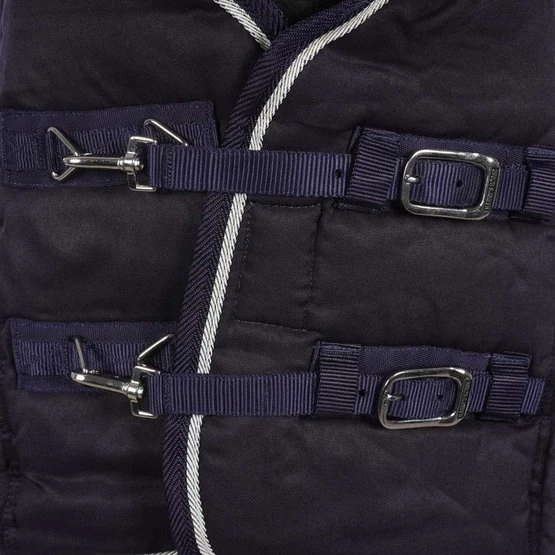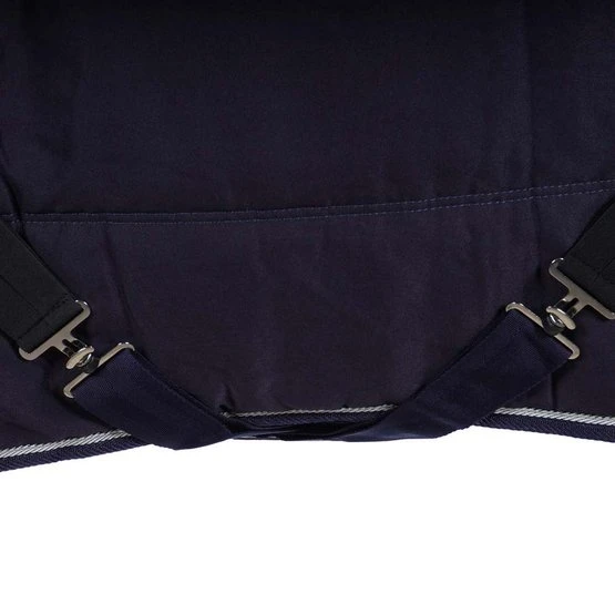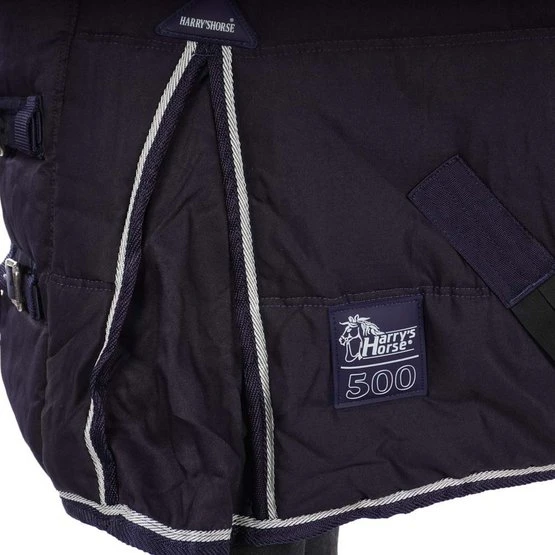 Harrys Horse Stalldecke Modell Highliner mit komfortablem Minihals und optimaler Passform. 300D Polyester, mit zweifarbiger Front und Zwickel, Schweiflatz, niedrige Kreuzbegurtung mit elastischem Einsatz. 2 Frontverschlüsse und abnehmbare elastische Beinschnüre. Diese Decke ist mit 500 Gramm gefüttert.
