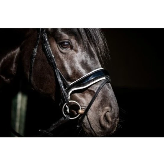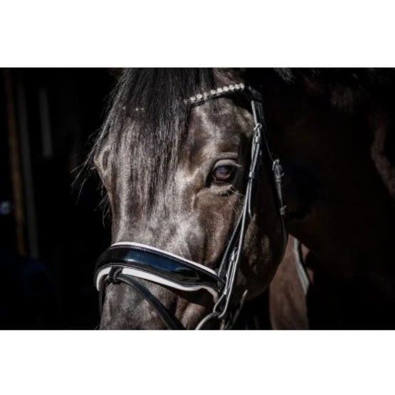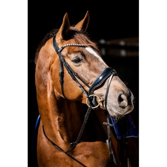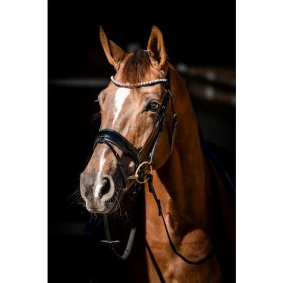Diese Trense wurde speziell mit einem anatomisch weich gepolsterten und zurückgeschnittenen Genickstück entwickelt. Dieses Kopfstück ist so geformt, dass es den Druck hinter den Ohren und auf dem Kopf reduziert. Der Nasenriemen ist noch besser anatomisch geformt, was die Passform noch besser macht und den Druck auf die Nase reduziert. Das Stirnband ist speziell mit großen Swarovski-Steinen gefertigt. Kommt mit weichen Lederzügeln.
