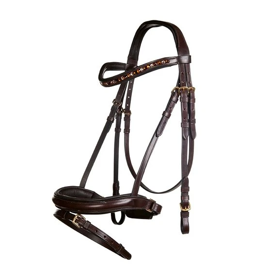 ● Messingfarbene Schnallen bei brauner Trense