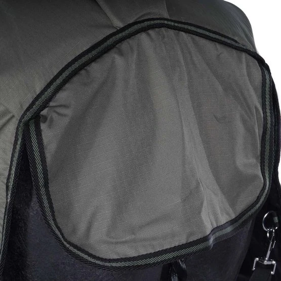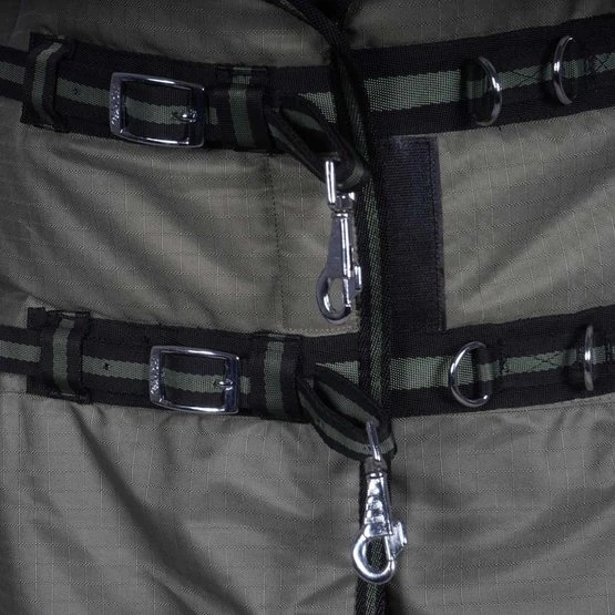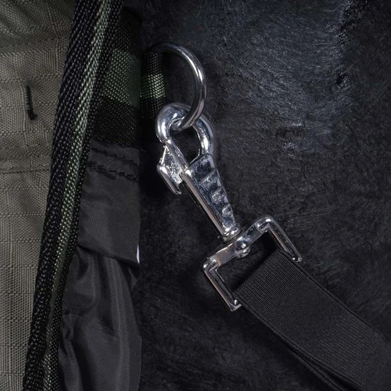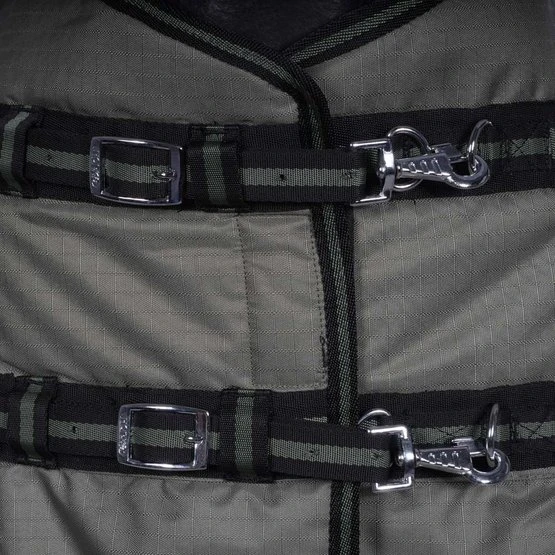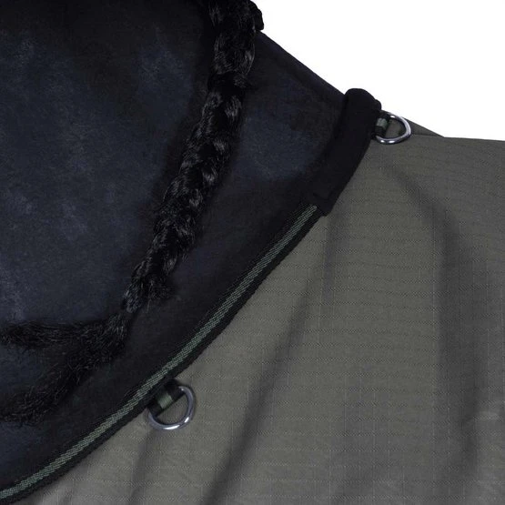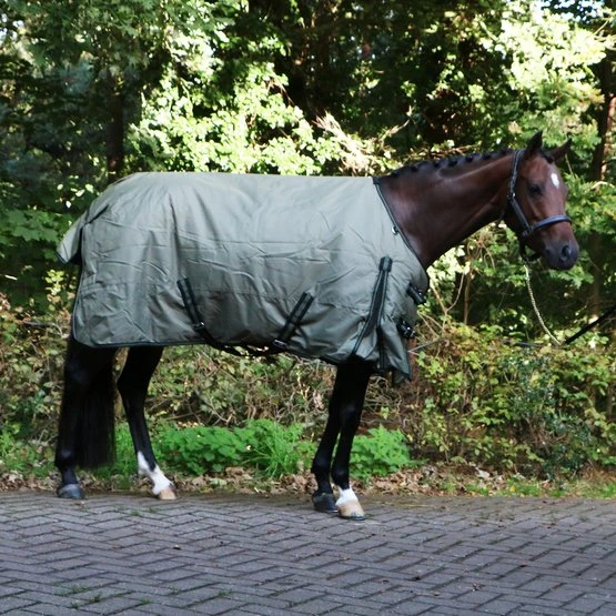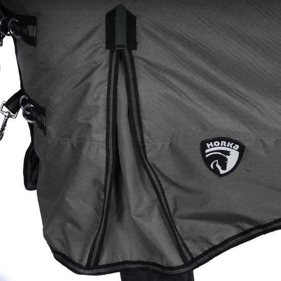 Diese Horka Outdoor Decke Dime 600D kann mit einem losen Hals kombiniert werden. Die Decke hat eine 200 Gramm Füllung und ein Polyesterfutter. Es gibt einen doppelt verstellbaren Verschluss auf der Brust, die Spannbänder haben ein elastisches Ende und Gummianschläge. Der Widerrist ist mit Fell gefüttert und es gibt Ringe, an denen der Hals mit Klettverschluss befestigt werden kann.