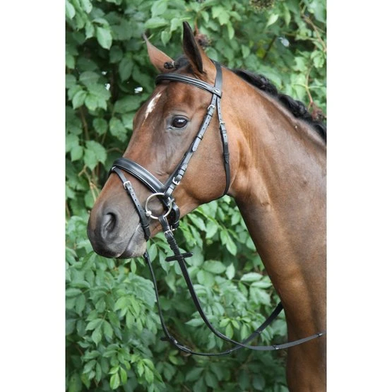 Zaumzeug Caran ist ein einfaches Zaumzeug mit einem schwedischen oder durchziehbaren Nasenband mit Blitzriemen.