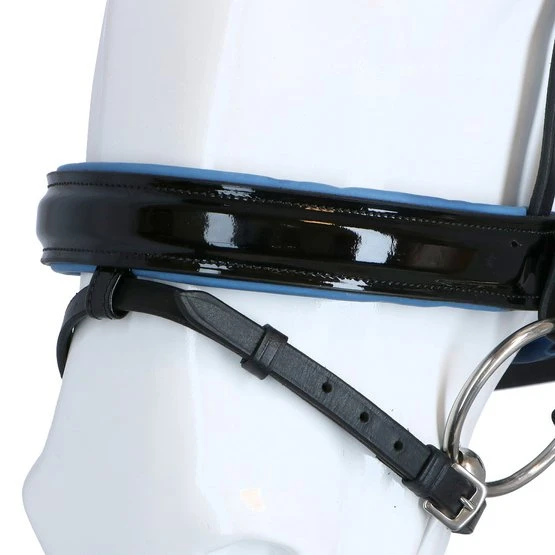 Schillerndes Zaumzeug mit schwedischem Lackleder-Nasenband mit Blitzriemen.
