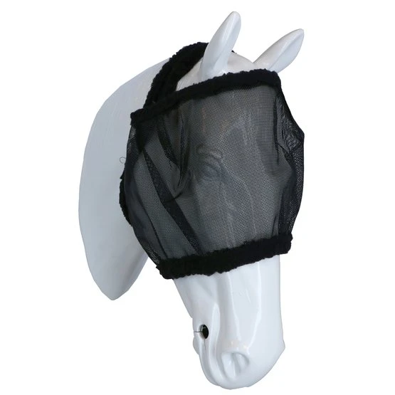 Fliegenmasken ohne Ohren aus engmaschigen festem Netzgewebe. Mit Klettverschluss, verstellbar. Elastischer Bund mit Einfassung aus Kunstlamm, dadurch sehr enganliegend am Kopf.