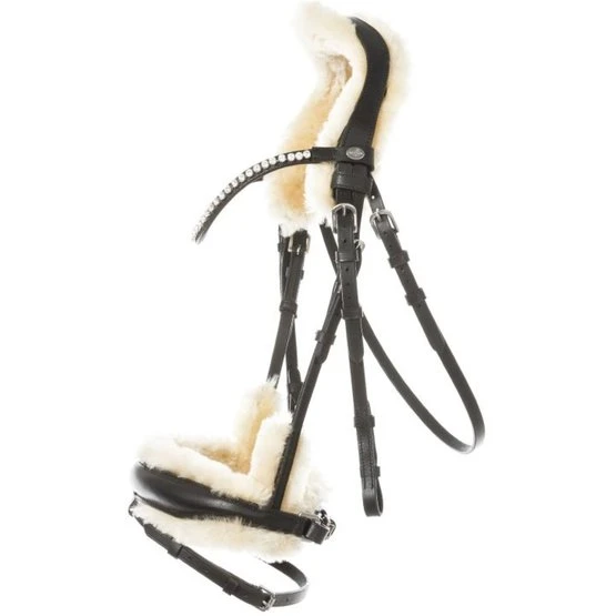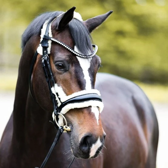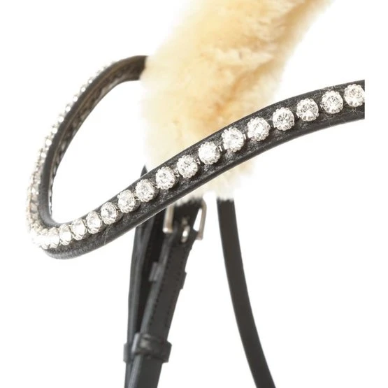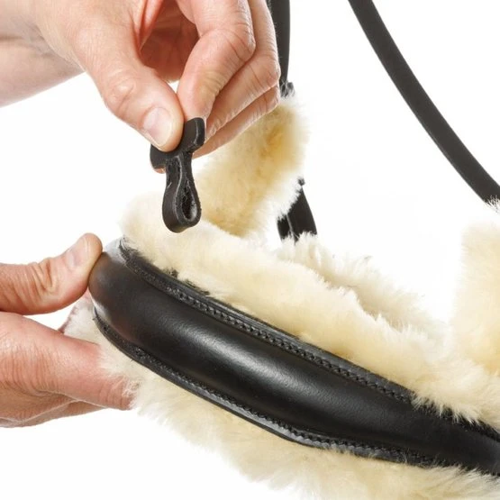 – Extrakomfort für sensible Pferde durch seitlich verlängertes Lammfellpolster sowie Lammfell an Genick und Nasenriemen