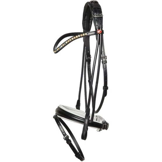 Rundstichelemente, der konisch geformte Nasenriemen und ein glitzernder, mit Kristallen besetzter Stirnriemen machen diese Trense zu einem Hingucker. Das Zaumzeug Silvie II ist mit oder ohne Lacklederfutter in Schwarz oder Weiß erhältlich und wird mit einem wunderschönen geschwungenen Stirnband geliefert, das mit Kieffer Ultrashine®-Kristallen in der Farbkombination Ihrer Wahl verziert ist.