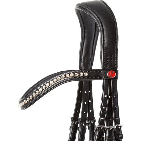 Mit Hilfe des breiter geschnittenen, anatomisch geformten Kopfstücks wird der Druck im Genick vermindert und gleichzeitig ist ausreichend Bewegungsspielraum für die Ohren gegeben. Für noch mehr Komfort sind Kopfstück und Reithalfter mit einer weichen Polsterung ausgestattet. Dieser pferdefreundliche Zaum ist mit geschwungenem, bombierten Lederstirnband oder mit Kristallstirnband erhältlich.