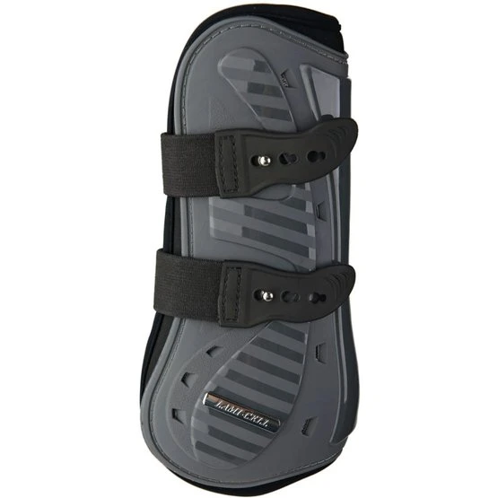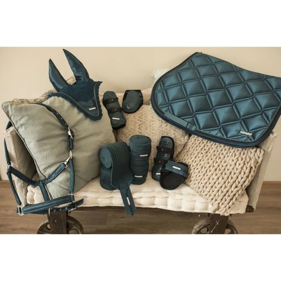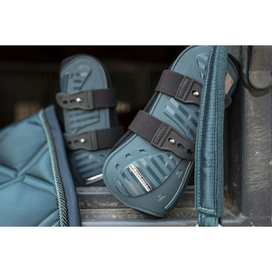 Sehnenschoner-Set Aurora. PU-Außenmaterial mit Neoprenfutter. Gamaschen mit Schnellverschluss und Streichkappen mit Klettverschluss mit Satinbesatz.