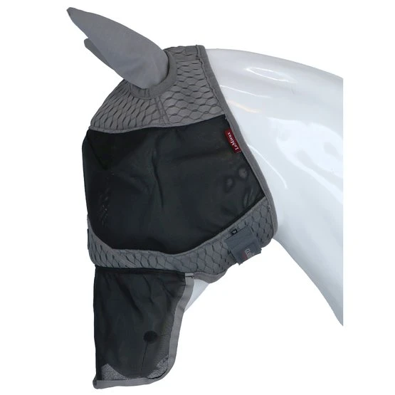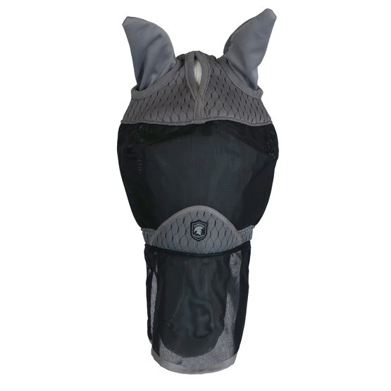 Komfort hat höchste Priorität, mit einer weichen, atmungsaktiven Bambuspolsterung über dem Nasenbein und über den Augen. Dies hilft, Reibung zu vermeiden und stellt sicher, dass die Maske weit von den Augen entfernt bleibt. Das Netz besteht aus UV-beständigem Material, sodass die Reizung durch die Sonne auf ein Minimum reduziert wird. Die Maske hat Gummizüge am Kiefer und hinter den Ohren, um einen guten Sitz zu gewährleisten und das Pferd beim Grasen nicht zu behindern. Die Maske besteht aus einer oberen Schicht aus Carbon-Mesh-Material, das dafür sorgt, dass das Pferd kühl bleibt. Auch für die Windschutzscheibe wurde eine Aussparung vorgenommen.