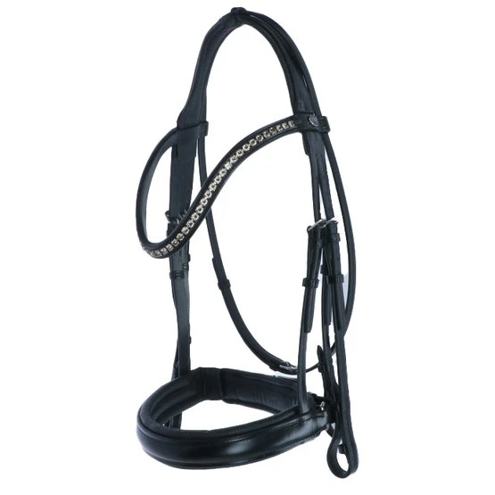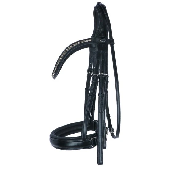 Der flache Kandarenknopfzaum ist ganz besonders pferdefreundlich. Denn die Kandare Fortuna hat innovative, elastische Einsätze, die beidseitig optisch versteckt unter dem Stirnriemen mit Strasssteinen liegen und das weich unterfütterte Genickstück mit den Backenstücken und dem Reithalfter verbinden. Der Druck aufs Genick wird dadurch nachhaltig gemindert und die Kau- und Maultätigkeit des Pferdes kann deutlich angeregt werden. Das Reiten in der Anlehnung wirkt so wesentlich angenehmer auf das empfindliche Pferdemaul – selbst Zungenprobleme werden weitestgehend vermieden. Die exklusive Kandare Fortuna ist mit einem weich unterfütterten Reithalfter Spezial ausgestattet. Diese Trense wird inkl. Zügeln geliefert.