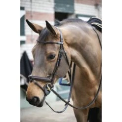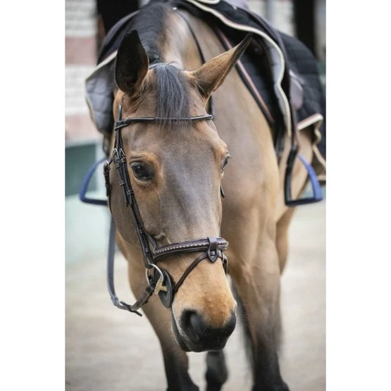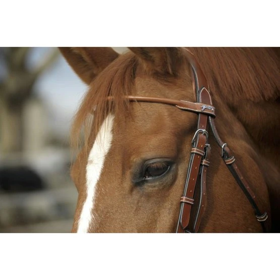 Wunderschöner Trensenzaum aus italienischem Leder. Halbrunder Nasenriemen mit dekorativer Ziernaht und zwei lackierten Paspeln. Genickstück und Nasenriemen mit Rindsleder unterlegt. Passend zu den Paspeln auf dem Nasenriemen lackierter Stirnriemen. Gummizügel.