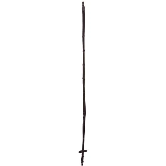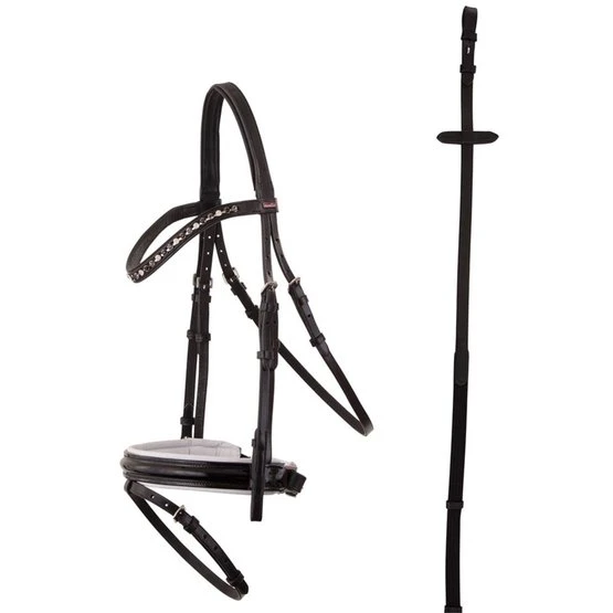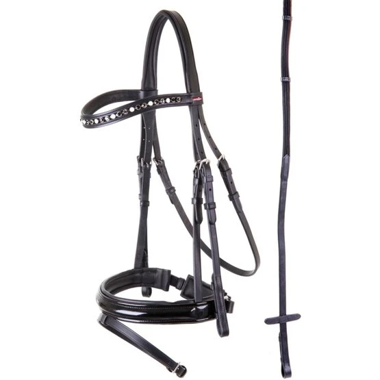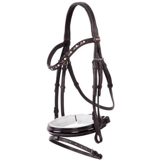 Symmetrische Trense mit anatomisch geformtem, weich gepolstertem Genickstück, das an den Ohren zurückgeschnitten ist. Das leicht geschwungene Stirnband ist weich unterlegt und hat 3-farbige (Basalt/Schwarz/Opal) XL Strasssteine. Der breite (± 4 cm) schwedisch kombinierte Nasenriemen aus Lackleder ist weich gepolstert und hat ein weiches Kinnpolster. Die Backenstücke haben Zaumhaken. Die Trense hat Edelstahlbeschläge. Die Gurtzügel haben Lederstege, Martingalschieber und Zaumhaken.