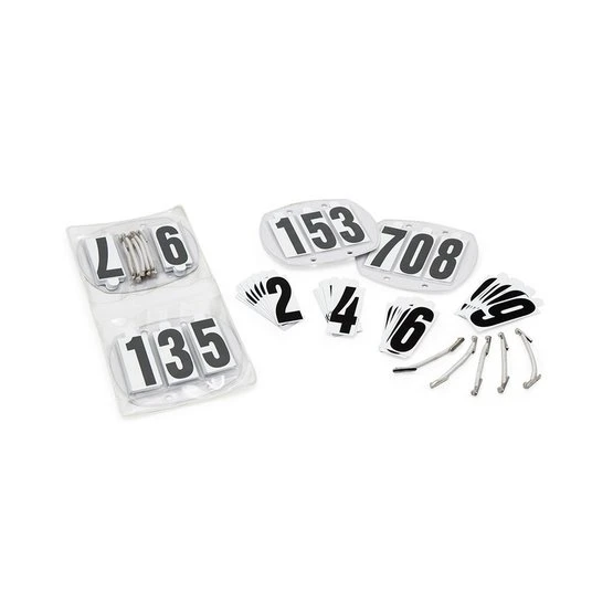 Dieses Smart-Wipe-Clean-Nummernhalter-Set besteht aus zwei Haltern mit elastischen Befestigungen, 4 Zahlensets und einer kompakten Aufbewahrungsmappe. Haltermaße: 90mm x 84mm