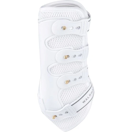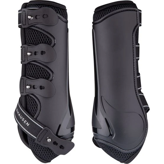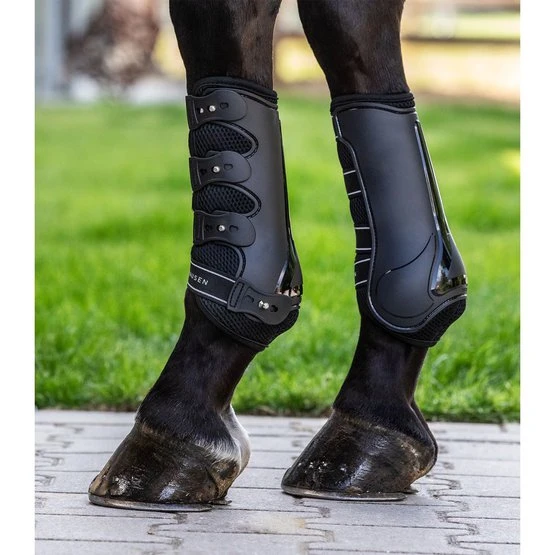 Anatomisch geformte Außenschale. Stoßabsorbierend und besonders Luftdurchlässig durch eine spezielle Mesh-Polsterung. 3fach verstellbar durch praktischen Knopf-Schnellverschluss mit Elastikstrippen für eine optimale Anpassungs ans Pferdebein. Paar